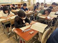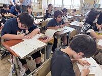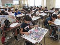 【11日(木)の朝のNIEタイムの様子】全校で一斉に、新聞を広げて取り組んでいますノート・レポート
