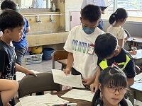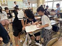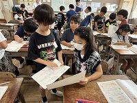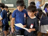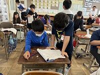 本校の特色ある取組の一つとして、「NIE教育」があります。先週11日(木)の朝の活動の時間は、「NIEタイム」で、KODOMO新聞を各教室へ配付して、新聞をじっくり読む時間でした。そして、その日の宿題で「記事についての考えを書き」ました鉛筆翌日12日(金)の朝、「友達の書いてきたカードを読み合う」という活動をしていますグループ