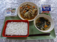 ごはん 牛乳 とりにくのからあげ だいずのいそに じゃがいもとさやえんどうのみそしる