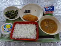今日は、暑いときにも食欲を増してくれるドライカレーです。ドライカレーの具には、にんじん・たまねぎ・ピーマンなどが細かく刻まれて、豚肉といっしょにカレールウに入っています。野菜が少し苦手な人でもおいしく食べられるメニューです。