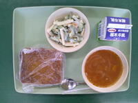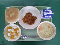 まるパン ぎゅうにゅう ハンバーグトマトソース とうにゅうデザートあえ ようふうたまごスープ