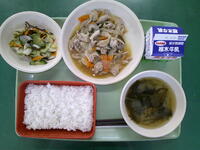 ごはん ぎゅうにゅう ダッカルビ こまつなのナムル わかめスープ