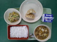 ごはん ぎゅうにゅう マーボーどうふ あげギョウザ ちゅうかあえ