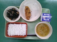 ごはん ぎゅうにゅう しろみざかなフライ だいずのいそに キャベツとさやえんどうのみそしる