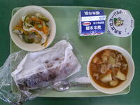 ごはん ぎゅうにゅう おさかなどんのぐ きゃべつときゅうりのこんぶづけ とんじる