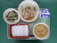 今日は、栃木市のおいしい食材を使った「とち介ランチ」です。栃木市産のぶた肉とたまねぎを使ったしんしょうが焼きと、トマトを使ったスープです。トマトは、JAしもつけの生産者の方に無償で提供していただきました。生産者の方に感謝し、味わっていただきましょう。