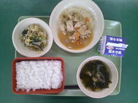 ごはん ぎゅうにゅう ダッカルビ こまつなのナムル わかめスープ