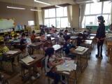 教室では、ランドセルから荷物を出して、机の中に整理したり、ロッカーにランドセルをしまったりします。6年生が、1年生教室に来て、やさしく手伝ってくれました。もちろん、自分でやりたいという子もいますが、困ったときに頼りにできるという安心が見られました。
