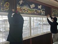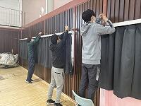 昨日の放課後、職員作業で、体育館に紅白幕等を設置しました。体育館の改修工事のため、これまで幕を支えるヒートンや釘が固定されていましたが、ほとんど外されてしまっていたため、それを付ける作業から行いました