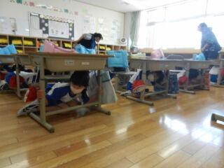 <地震発生の放送を聞いた1年生の様子> 机の脚をしっかりもって避難