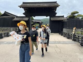 律之助さんのパスポートのコピーを実際に手に取って観察する子供たち。