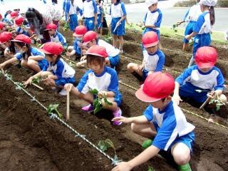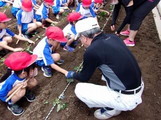 晴天の下、瓜畑のボランティアさんにご支援いただき、1年生と特別支援学級の児童がサツマイモの苗を植えました。ボランティアの皆様が事前に土を耕し、うねを立て、子供たちが苗を植えやすいように印を付けたロープを張ってくださるなど、準備をしてくださいました。子供たちはボランティアの皆様のお話をよく聞いて、丁寧に苗を植えていました。最後にみんなで「おいしいサツマイモができますように」と願いをかけて、楽しい作業が終了しました。瓜畑ボランティアの皆様ありがとうございました。