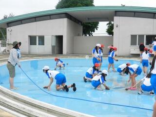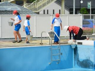 5・6年生と職員によるプール清掃を行いました。1年間眠っていたプールの底には、汚れがいっぱい。たくさんのヤゴの住みかにもなっていたようです。子どもたちと職員で清掃し、見違えるほどきれいになりました。職員による点検も行い、安全にプールでの活動が楽しめそうです。5・6年生のみなさん、ありがとうございました。