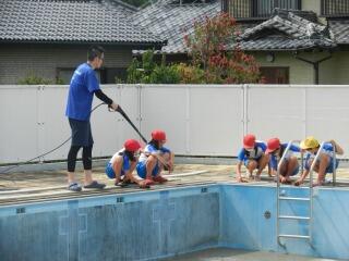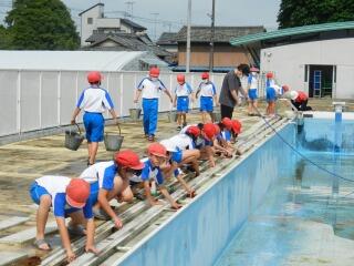 5・6年生と職員によるプール清掃を行いました。1年間眠っていたプールの底には、汚れがいっぱい。たくさんのヤゴの住みかにもなっていたようです。子どもたちと職員で清掃し、見違えるほどきれいになりました。職員による点検も行い、安全にプールでの活動が楽しめそうです。5・6年生のみなさん、ありがとうございました。