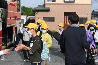 消毒をしてバスに乗車。あいさつも元気よくできていました!