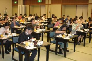 感染症対策のため、今のところ学校での調理実習は見合わせていますが、手袋の着用・自分のお茶は自分で入れる・お茶を飲むときは話をしない・家庭科室と知新館ホールとの仕切りを外して活動の部屋を広くする等の対策をして、「お茶の入れ方」の実習を行いました。5年生にとっては初めての家庭科の実習。用具を丁寧に扱い、上手に緑茶を入れていました。子供たちと先生で試飲。ほっこりした笑顔があふれた一時でした。