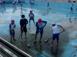 5・6年生と職員でプール清掃を行いました。本校には低学年用のプールもあり、2つのプールがあります。暑い中での作業でしたが、高学年の子供たちは一生懸命清掃に取り組んでいました。職員が仕上げをして、水色が映えるきれいなプールになりました。今年度も安全指導と感染症対策を十分に行い、安全にプールを使っての学習を行っていきます。