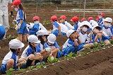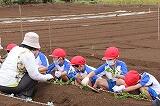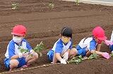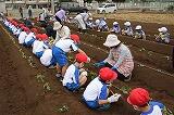 今日は2時間目に2年生が、3時間目に1年生が、瓜畑自治会のボランティアさんにご指導いただきながら、サツマイモの植え付けを行いました。昨日かなり雨が降って、農園の状態が心配だったのですが、雨が上がったのが早かったので、土に適度に湿っていて、植え付けには最高のコンディションでした。1年生も2年生も初めての体験(2年生が1年生の時は臨時休校中でした。)だったので、とても楽しそうに活動していました。