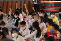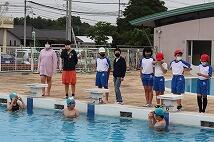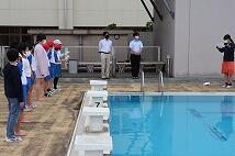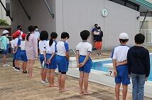 去年は水泳学習を見送りましたが、今年は何とか子どもたちをプールに入れてあげたいと授業の方法について検討し、十分感染対策をとった上で実施することにしました。そしてこの日の昼休みに運動委員児童により2年ぶりのプール開きを行いました。本来であれば全校児童をプールサイドに集めて水泳学習への関心や安全意識を高めたかったのですが、密集を避けられないため運動委員のみの参加としました。代表児童の安全に学習に臨む決意表明の後、3名の児童が泳ぎ初めを行いました。後日この様子を全児童に画像と校内放送で知らせて、プール開きの目的が共有できるようにする予定です。