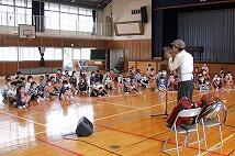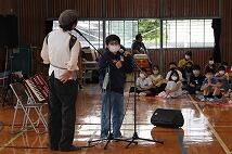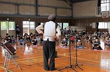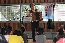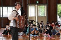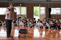 今日は新井武人さんをお招きしてアコーディオンの音楽鑑賞会を行いました。コロナ感染対策を考えて5校時には1~3年生、6校時は4~6年生対象に2公演していただき、全校生が体育館に集まることを避けての実施としました。ここのところいろいろな行事が中止になったりしている中での久しぶりの鑑賞会だったので、アコーディオンの少し物悲しいようなそれでいて華やかで素敵な音色に子どもたちはすぐに引き込まれ、45分間の公演があっという間に感じられたようです。魔女の宅急便とトトロ・ハウルのテーマソングメドレーや鬼滅の刃の紅蓮華などの曲目に、手拍子を打ったり体を揺らしたりしながら音楽と一体化できた楽しい時間となりました。実は新井武人さんは、約4年前に半崎美子さんと一緒に本校に来て6年生を送る会で演奏してくださっています。今の6年生は1年生の時以来の懐かしの再会となりました。