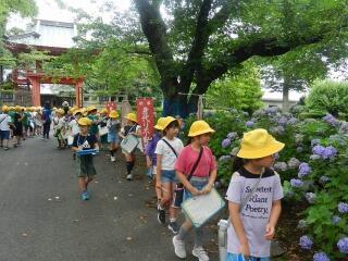 町たんけん2回目は、主に学校の北側から東側を歩きました。北側では神社やお寺、お菓子屋さんや畳屋さん、公民館などを発見。東側では、麦や野菜の畑、保育園や児童館等を発見。学校の前の道路では、子どもたちの大好きな駄菓子屋さんにお目にかかって、ご挨拶を交わしました。今回も、約1時間の学校たんけんで、様々な発見をした子どもたち。友達や先生にどんなことを伝えてくれるのか、今後の学習が楽しみです。
