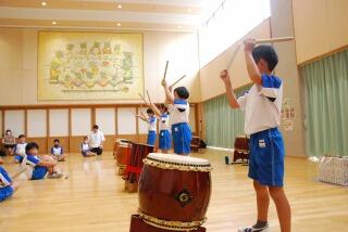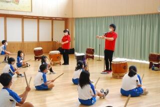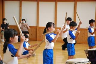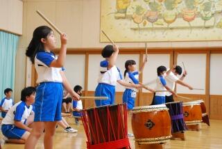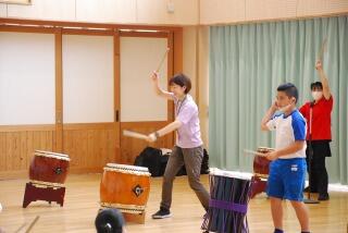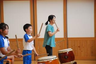 お手本を見ながら、一生懸命太鼓を打つ子どもたち