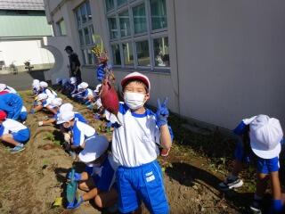 瓜畑のボランティアの皆様にご指導いただき、1年生とひまわり学級・あおぞら学級の子供たちがサツマイモ掘りを行いました。ボランティアの皆様に畝立てのお手伝いやサツマイモ苗の植え方を教えていただいたのが、5月。5ヶ月間にサツマイモはたくさんの葉を付け、長く長くつるが伸びました。「本当にサツマイモはできているのかなあ。」「大きいサツマイモがとれるかなあ。」子供たちはドキドキワクワク。ボランティアさんのお話をよく聞いて、丁寧に土を掘りました。土の中にサツマイモを見つけたときの子供たちの嬉しそうな顔。快晴の秋空のもの、子供たちの笑顔いっぱいのサツマイモ掘りとなりました。
