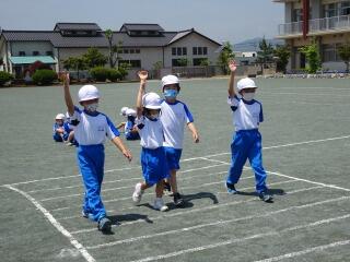 高く手をあげて渡ります。「交通ルールを守って安全に登下校しましょう。」「はーい」