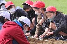 今日の2校時に5年生がジャガイモの植え付けを行いました。ボランティアの皆さんが昨日から整地してくださった学校農園で、植え付け方を教えてもらいながら実施しました。空気はやや冷たいものの気持ちの良い春の日差しの中で、久しぶりに屋外で土とふれ合う活動をすることができて、子どもたちはとてもうれしそうでした。