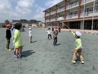 休み時間:長縄で遊ぶ2年生と6年生。気分をリフレッシュ!