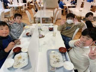 自然の家での初めての食事。室内になりましたが、みんな笑顔です。