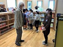 本校には絵本作家 いわむらかずお 先生の『14ひきのシリーズ』の大きな絵画が4枚あります。みんなのステージの1枚が春を、図書室にある2枚が夏と秋を、そして知新館ホールの1枚が冬を表し4枚で1年間を表しています。本校を来校される皆さんが羨ましがる新校舎の最大の特徴と言っても過言ではありません。そのいわむらかずお先生には新校舎落成時に一度御来校いただいたのですが、今回約6年ぶりに2度目の御来校をいただきました。コロナ感染対策のため、知新館ホールには6年生が、他の学年はオンラインで繋いで各教室で先生のお話を聞きました。お話しだけでなく、途中に『14ひきのこもりうた』の読み聞かせをしていただいたり質問コーナーでお答えいただいたりもしました。また、昼休みには図書室で、本を借りに来た子どもたちと先生が交流される時間ももつことができました。多くの出版文化賞や絵画賞・フランスの芸術文化勲章も受章されている高名な先生に、本校知新館ホールの14ひきシリーズの大絵画の前でお話しいただくという、とても貴重な機会となりました。