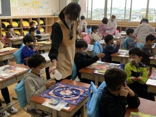 入学して約3週間。1年生も給食や昼休みもはじまり、小学校生活に慣れてきました。今日は、図書の本の借り方を学び、入学して初めて学校の本を借りました。担任の先生と図書の先生のお話をよく聞いて、本の借り方や図書室を使うときの約束を学習しました。今日は絵本を1冊借りました。短時間で読みたい本を選び、きちんと並んで図書の先生に貸し出しの処理をしてもらうことができていました。自分の読みたい本を手に取った子供たちは、とてもうれしそうでした。いわむらかずお先生の大きな絵が掲げられた、本校の自慢の図書室。明るく温かな雰囲気の図書室をどんどん利用し、たくさんの本とふれ合ってほしいと思います。