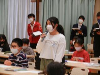 全体での話し合い。いつもの授業とは違って、マイクを使っての発言でしたが、積極的に自分の考えを伝えていました。