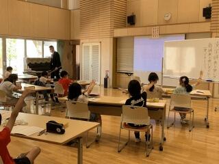 「総合学習室」での授業。先生の発問に積極的に手をあげて、自分の考えを発表していました。