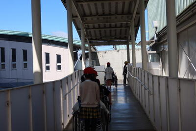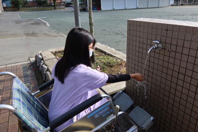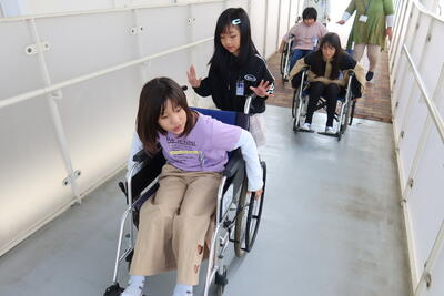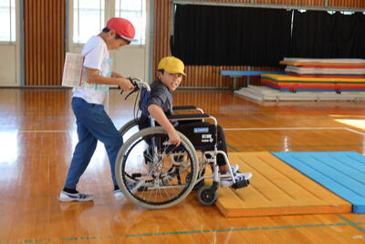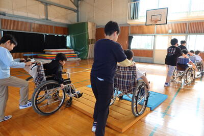 目的に応じた様々な車いすの形状や歴史を知ったり、体育館から校庭の水道まで実際に車いすに乗ったりしました。体験の中で、子どもたちは自分一人でできることや、サポートが必要になることを実感しました。