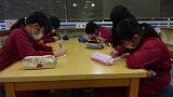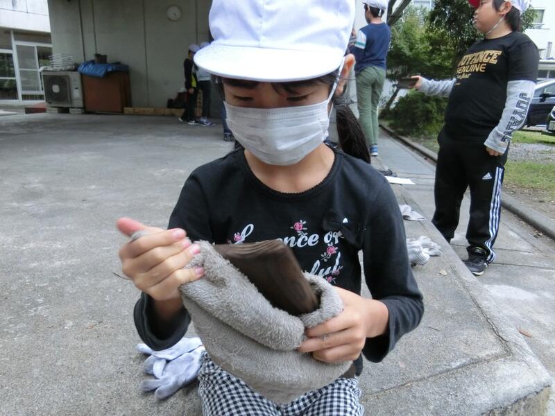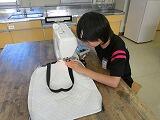 4年生は、書写の時間に書いた作品を自分達で裏打ちしました。半紙を裏返して机に置き、霧吹きで濡らした後、障子を貼るのりを指で塗り広げます。そこに空気が入らないように薄い画用紙を貼りつけ、三連休中乾かしておきました。休み明け、学校に来ると、自然に机からはがれてきていました。そーっと手ではいでみると、空気がほとんど入っていないきれいな裏打ちができていました!はさみで余分な画用紙を切り取って完成!裏打ちをすると、見栄えがさらに良くなることがわかりました。