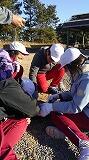 まずは、お椀とお椀に稲を挟み、茎を引っ張って、お椀の中に籾を落としました。お椀とお椀をくっつけ、隙間を作らないようにすることが、難しいようでした。子どもたちは、機械のない時代の人の大変さを経験することができました。一つかみの稲の束を子どもたちが脱穀をしてい間に、干してあった稲をコンバインで川島様があっという間に脱穀してくださいました。最後に袋に入れて終了です。今年は、27.5キログラムの籾がとれました。