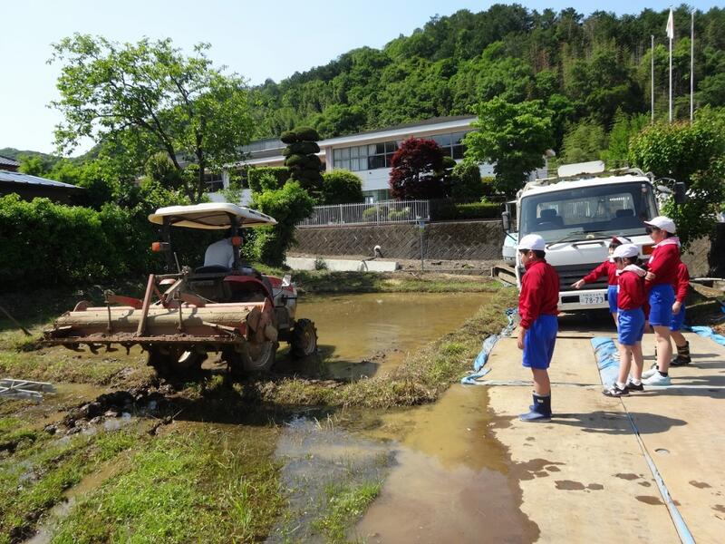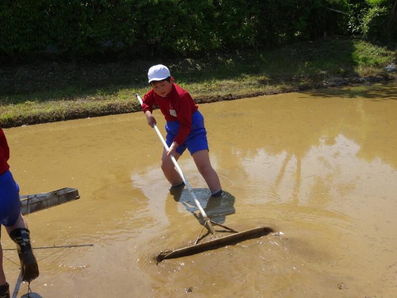 巧みなトラクターのドライブテクニックで、まんべんなく田を耕してくださった川島様に、子どもたちは、拍手!その後、代かきの仕方を教えていただき、いざ!挑戦!!最初は、ならし棒の扱いに戸惑っていた子どもたちでしたが、時間が経つにつれ、押したり引いたりして、上手に田んぼをならすことができるようになりました。