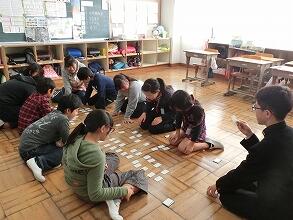 11月9日小中交流活動が行われました。1年生は生活科「しゃぼんだまを作ろう」、2年生は生活科「牛乳パックでカズーを作ろう」、3年生は社会「はたらく車」、4年生は体育「みんなでジャンプ(長縄跳び)」、5年生は英語「ビンゴゲーム」、6年生は国語「百人一首に挑戦」の活動を行いました。中学生は教材をよく準備し、子どもたちもとても楽しそうに交流活動を行っていました。