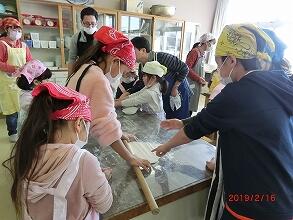2月16日(土)休日ボランティアによる耳うどん作りが行われました。耳うどんは、その形が「耳」に似ていることから「耳うどん」とよばれている佐野市の郷土料理で、その耳うどんを食べると、一年中悪いことが聞こえないですむと言われているそうです。作り方は、地粉に水と塩を入れて、よくこねる、そしてのばして、切る。切ったものを耳の形にして、ゆでる。ゆでた後は、温かいお汁の中に入れて、少し煮たらできあがりです。また、耳の形にできなかったうどんの切れ端は、ゆでた後に、きなこと黒蜜をかけて食べました。みんな楽しそうに、耳うどんを作っていました。最後は、できた耳うどんをみんなで食べました。とてもおいしかったです。休日ボランティアの皆様ありがとうございました。