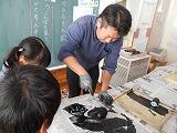 1月10日(金)に新里様から3回目の版画指導をいただきました。第3回目は、「刷り」でした。インクののばし方、つけ方、ばれんでのこすり方を丁寧に教えていただきました。バックにスポンジローラーでカラーインクをつけるやり方も教えていただきました。子どもたちは、自分の力で刷ったという自信もあり、刷り上がった作品にとても満足そうでした。新里様にはお忙しいところ御指導いただき、ありがとうございました。