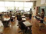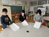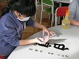 4年生は、書写の時間に書いた作品を自分達で裏打ちしました。半紙を裏返して机に置き、霧吹きで濡らした後、障子を貼るのりを指で塗り広げます。そこに空気が入らないように薄い画用紙を貼りつけ、三連休中乾かしておきました。休み明け、学校に来ると、自然に机からはがれてきていました。そーっと手ではいでみると、空気がほとんど入っていないきれいな裏打ちができていました!はさみで余分な画用紙を切り取って完成!裏打ちをすると、見栄えがさらに良くなることがわかりました。