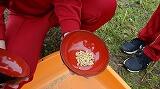 まずは、お椀とお椀に稲を挟み、茎を引っ張って、お椀の中に籾を落としました。お椀とお椀をくっつけ、隙間を作らないようにすることが、難しいようでした。子どもたちは、機械のない時代の人の大変さを経験することができました。一つかみの稲の束を子どもたちが脱穀をしてい間に、干してあった稲をコンバインで川島様があっという間に脱穀してくださいました。最後に袋に入れて終了です。今年は、27.5キログラムの籾がとれました。