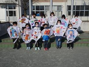 2月9日、1年生はたこあげに挑戦しました。生活科の学習で作成したたこです。たこには思い思いの絵が描かれていました。少し風が強い日だったので、1年生と同じくたこも元気よく空を飛んでいました。みんな歓声を上げながらたこあげを楽しんでいました。みんなで記念写真も撮りました。思い出の1枚になりました。