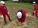 稲刈りを終え、10月13日は本当の意味での収穫を迎えました。稲を機械に通して脱穀し、残ったいなわらを結びました。いなわらは、なかなか固く、さすがの5年生も結ぶことに苦戦していました。しかし、川島末治さんに結び方をよく教えていただき、協力し合って、たくさんのいなわらを結ぶことができました。また、脱穀したお米に、子ども達は興味津々でした。