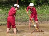 22日(水)、5年生は地域ボランティアの川島様に御指導いただきながら、代かきをしました。はじめに、もみ種蒔きのときに質問した「イネの害虫と益虫」について、本を見せていただきました。実際にどんな虫なのか知ることができ、子どもたちは興味をもっていました。その後、トラクターで田を耕していただき、いよいよ代かきをしました。初めはぎこちなかったものの、段々と上手にトンボを使えるようになり、田の土を平らにすることができました。27日(月)に、全校児童で田植えをします!