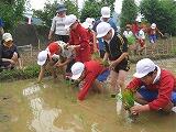今年も全校生28名が、山﨑久美男様から借用している学校前の田んぼで、学校支援ボランティア川島末治様の御指導のもと、田植えを行いました。田植え前の準備として、5年生が総合的な学習の時間を使って、川島様に分かりやすく教えていただきながら、苗を育てたり、田んぼの代掻きの準備もおこなってきてくれました。そのきちんと整備された田んぼに一歩足をふみいれると、冷たくてぬるっとした感触に、思わず声をあげたり、笑顔がこぼれました。苗の植え方を教えていただいた後、赤い目印のついたロープの後ろに並んで、曲がらないように、そして、しっかりと根づくよう泥の中に深く植えこみました。初めは慣れない手つきでしたが、しだいにこつをつかんで、川島様からもとても上手に植えることができたとお褒めの言葉をいただきました。どろんこになりながら、みんなで一生懸命がんばったかいがありました。秋の収穫を楽しみにしながら、田んぼの観察や世話をしていきたいと思います。