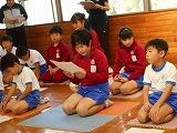 今回の落語教室では、閉校式で披露する予定の『寿限無』の練習を行いました。1~4年生は、長くめでたい名前を暗記し、みんなでそろえて言えるように練習しました。5・6年生は、登場人物になりきって、話のやりとりをしていることが分かるように顔の向きをかえたり、口調を工夫したりしながら練習しました。