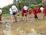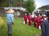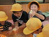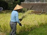 稲刈りを終え、10月13日は本当の意味での収穫を迎えました。稲を機械に通して脱穀し、残ったいなわらを結びました。いなわらは、なかなか固く、さすがの5年生も結ぶことに苦戦していました。しかし、川島末治さんに結び方をよく教えていただき、協力し合って、たくさんのいなわらを結ぶことができました。また、脱穀したお米に、子ども達は興味津々でした。